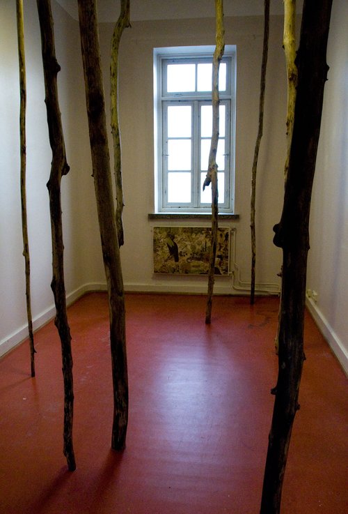 Site specific sculpture made of striped twigs. Collaboration with Ulrika Orvedal.