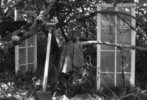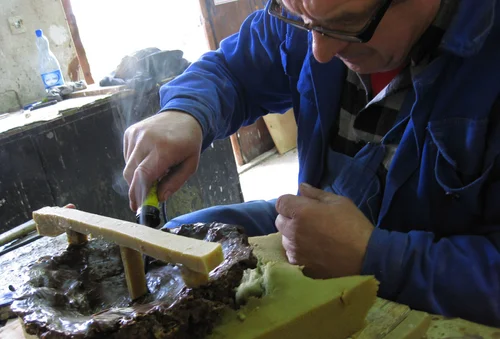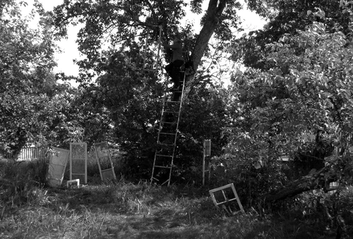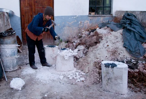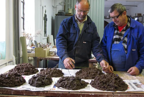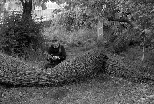 Konstruksjon av bjørk, modellert med cob; en blandning av leire og røytet vinterpels fra hest, overflatebehandlet med rå linolje.